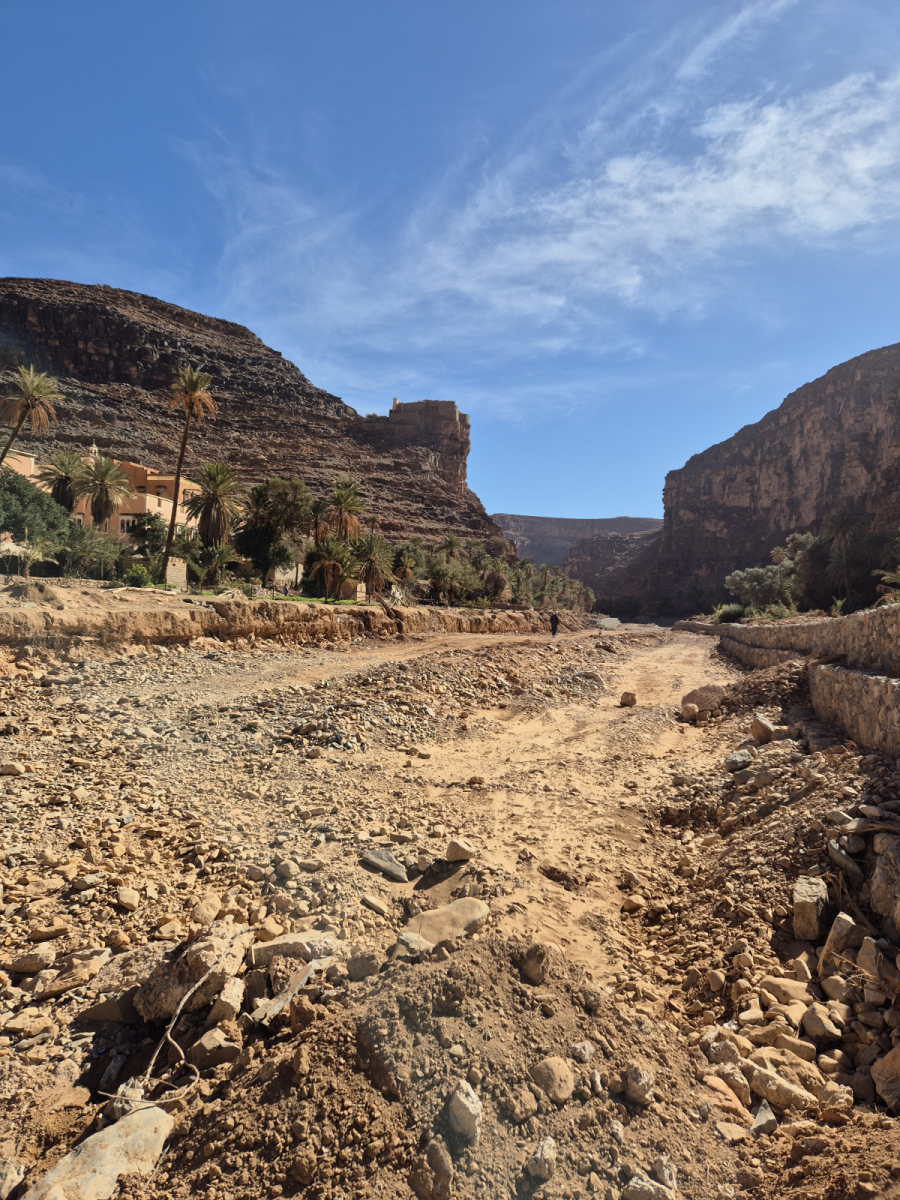 In einem der vorherigen Beiträge hatten wir schon mal kurz erwähnt, dass Agadir zwar eine Stadt in Marokko ist, aber das Wort eigentlich „befestigter Ort“ oder „Festung“ bedeutet. Historisch diente ein Agadir als Speicherfestung – ein gut gesichertes Lager für lebenswichtige Güter: Getreide, Olivenöl, Salz, Gewürze und manchmal auch Waffen. Im Falle eines Angriffs konnten die Anwohner sich selber und ihr Vieh ebenfalls in Sicherheit bringen. Der Agadir Id Aissa ist eine solche Speicherfestung und zwar eine sehr imposante. Er ist um die 800 Jahre alt, wurde aber 2007 restauriert und kann heute besichtigt werden. Zu Fuße des Agadirs liegt der Ort Amtoudi, die Straße dorthin ist eine Sackgasse. Es gibt einen Campingplatz, der vermutlich ausschließlich von den Touristen genutzt wird, die sich den Agadir anschauen wollen, bzw. in der naheliegenden Schlucht wandern wollen.