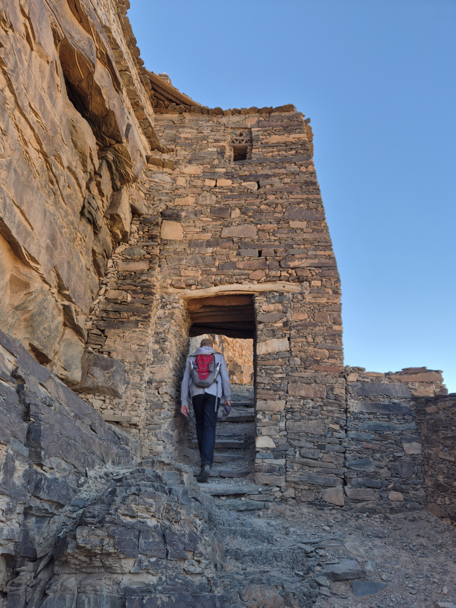 Das Teil ist echt beeindruckend, oben auf den Fels gebaut und gesichert. Jede Familie aus Amtoudi hatte dort ihre eigenen Räume. Über die Dächer der Gebäude wurde der Regen aufgefangen und über ein System von Rinnen in die Zisternen geführt. Überall sind die Lagerräume zu erkennen, teilweise konnten die nur über Leitern erreicht werden, alles sehr abenteuerlich.