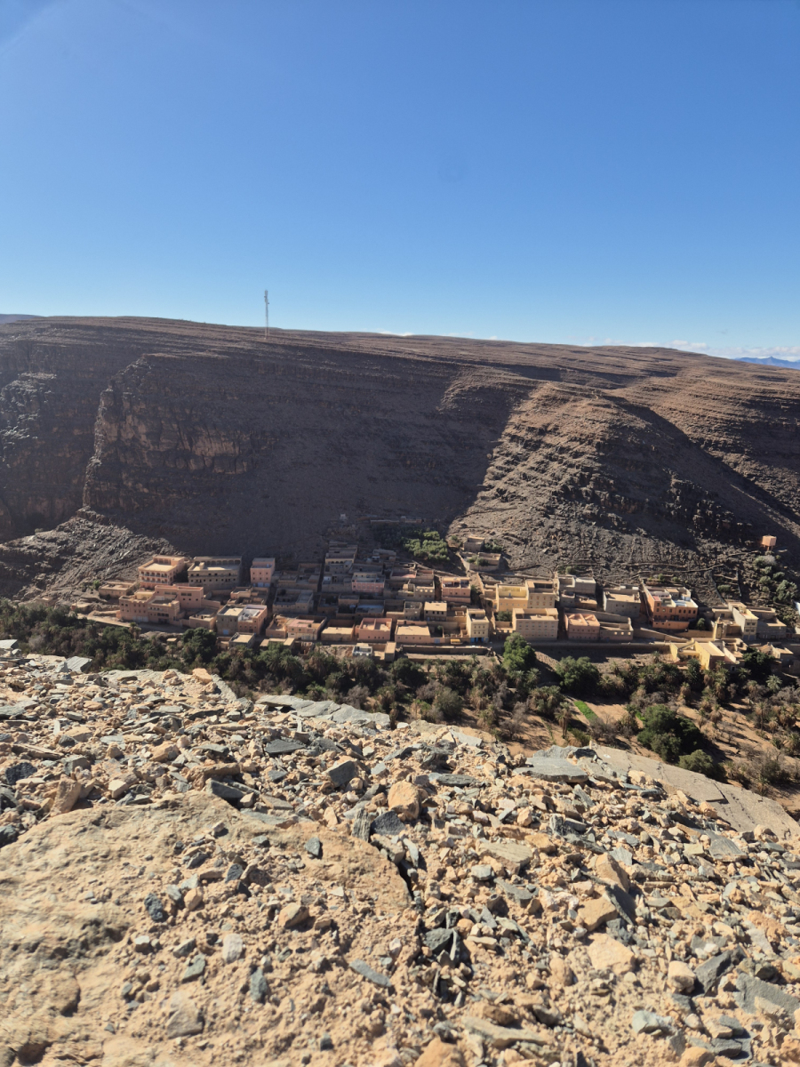 Der Ort liegt im westlichen Anti Atlasgebirge. Dieses google Maps Bild zeigt schon die beeindruckende Formation und Farben.
