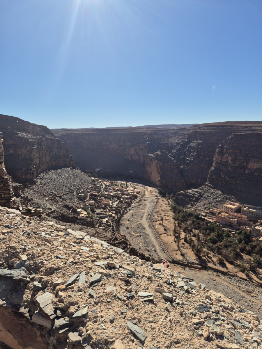 In einem der vorherigen Beiträge hatten wir schon mal kurz erwähnt, dass Agadir zwar eine Stadt in Marokko ist, aber das Wort eigentlich „befestigter Ort“ oder „Festung“ bedeutet. Historisch diente ein Agadir als Speicherfestung – ein gut gesichertes Lager für lebenswichtige Güter: Getreide, Olivenöl, Salz, Gewürze und manchmal auch Waffen. Im Falle eines Angriffs konnten die Anwohner sich selber und ihr Vieh ebenfalls in Sicherheit bringen. Der Agadir Id Aissa ist eine solche Speicherfestung und zwar eine sehr imposante. Er ist um die 800 Jahre alt, wurde aber 2007 restauriert und kann heute besichtigt werden. Zu Fuße des Agadirs liegt der Ort Amtoudi, die Straße dorthin ist eine Sackgasse. Es gibt einen Campingplatz, der vermutlich ausschließlich von den Touristen genutzt wird, die sich den Agadir anschauen wollen, bzw. in der naheliegenden Schlucht wandern wollen.