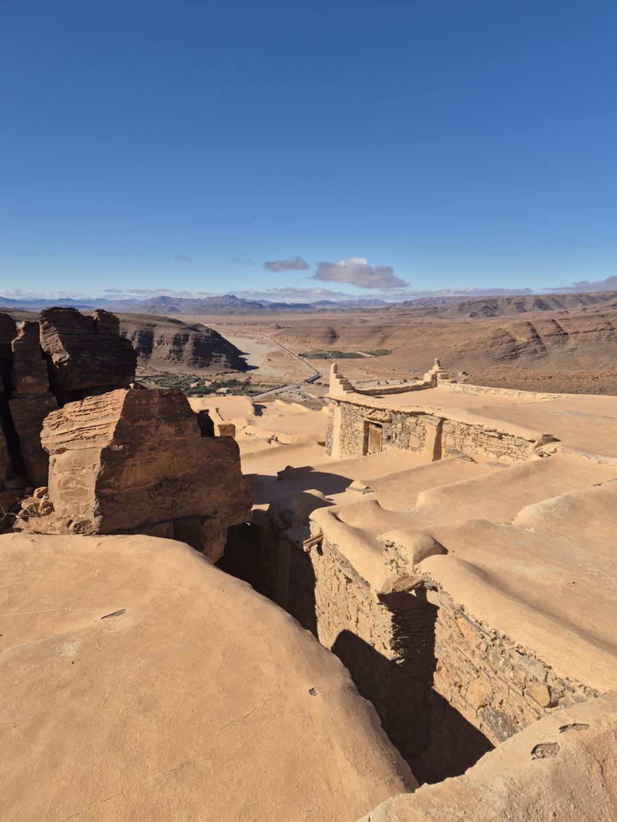 In einem der vorherigen Beiträge hatten wir schon mal kurz erwähnt, dass Agadir zwar eine Stadt in Marokko ist, aber das Wort eigentlich „befestigter Ort“ oder „Festung“ bedeutet. Historisch diente ein Agadir als Speicherfestung – ein gut gesichertes Lager für lebenswichtige Güter: Getreide, Olivenöl, Salz, Gewürze und manchmal auch Waffen. Im Falle eines Angriffs konnten die Anwohner sich selber und ihr Vieh ebenfalls in Sicherheit bringen. Der Agadir Id Aissa ist eine solche Speicherfestung und zwar eine sehr imposante. Er ist um die 800 Jahre alt, wurde aber 2007 restauriert und kann heute besichtigt werden. Zu Fuße des Agadirs liegt der Ort Amtoudi, die Straße dorthin ist eine Sackgasse. Es gibt einen Campingplatz, der vermutlich ausschließlich von den Touristen genutzt wird, die sich den Agadir anschauen wollen, bzw. in der naheliegenden Schlucht wandern wollen.