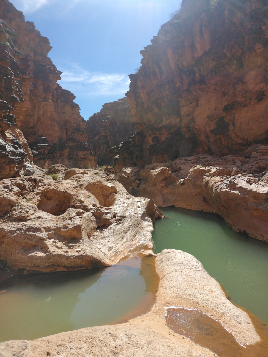 Eigentlich wollen wir am ersten Tag erst die Festung besteigen, doch am Morgen liegt das ganze Tal im Nebel. Wir sind uns nicht sicher, ob und wann sich der Nebel auflösen wird, daher beschließen wir zuerst die Schlucht zu durchwandern. Wir gehen zunächst durch den Ort, am Ende werden die Felswände enger und es gibt keine Häuser mehr. Wir folgen dem Flusslauf und sind mal wieder total begeistert von den steilen Wänden, die rechts und links nahezu senkrecht aufsteigen. Es geht über „Stock und Stein“ bis wir an einer Engstelle ankommen. Hier staut sich das Wasser und bildet kleine Tümpel. In diesen Tümpeln lebt ein kleine Fischart, die nur in diesen Tümpeln lebt. Wohl ein Überbleibsel aus der Zeit, als der Fluss ganzjährig und viel Wasser geführt hat.