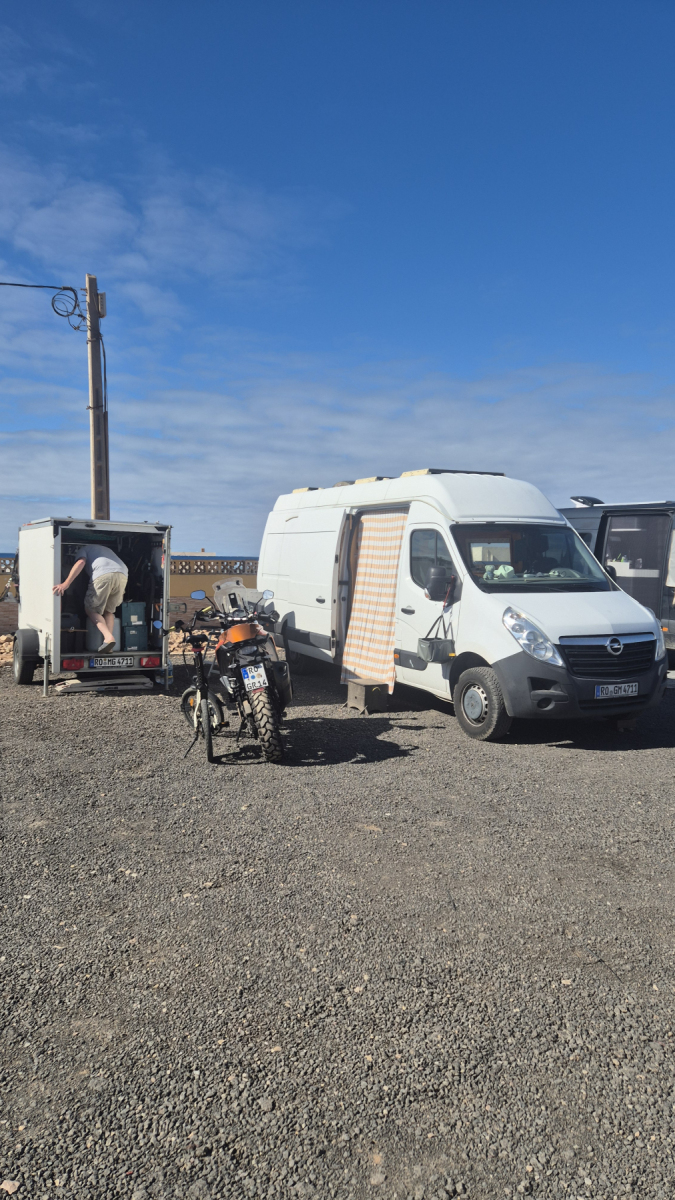 Unser Campingplatz liegt am Meer, wir können das ständige anrollen der Wellen hören. Besonders in der Nacht, wenn alle anderen Geräusche wegfallen, ist das richtig laut. Schon am ersten Abend kommt ein Fischverkäufer mit seinem uralten, verrosteten Peugeot-Mofa. Auf dem Gepäckständer eine Plastikkiste, in der befindet sich der aktuelle Fang in einer Wolldecke eingeschlagen. Er hat „nur“ eine Languste dabei, die er uns gerne verkaufen würde. Wir lehnen dankend ab, hätten aber gerne für den nächsten Tag eine Dorade. Und so bekommen wir einen wunderbaren Fisch, den er uns natürlich am Platz auch filetiert. Übrigens hatten alle unsere Campingplätze am Atlantik eigens dafür hergerichtet Waschbecken, in denen die Camper oder Fischverkäufer die Meeresfrüchte säubern können.