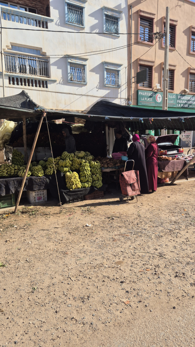 Der Ort selber ist vom Tourismus geprägt und zeigt sich so wie die meisten Orte am Meer, stark in die Jahre gekommene Uferpromenade, halb zerfallene Hotel- und Restaurant-Gebäude. Zwei drei Straßen von der Promenade weg beginnt dann das normale marokkanische Leben. Hier verbringen die Bewohner, in für uns Westeuropäer schwierig zu verstehenden Umständen ihr normales Leben. Wir besuchen den Wochenmarkt, der sich hier eine breite Straße entlang ausbreitet. Ähnlich wie schon in Sidi Ifni, interessant anzusehen. Wir kaufen in der bereits beschriebenen Manier frisches Obst und Gemüse ein.