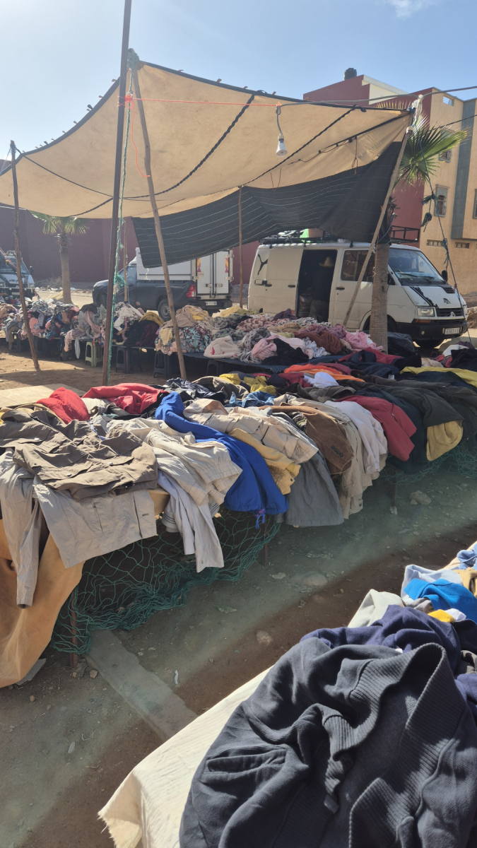 Der Ort selber ist vom Tourismus geprägt und zeigt sich so wie die meisten Orte am Meer, stark in die Jahre gekommene Uferpromenade, halb zerfallene Hotel- und Restaurant-Gebäude. Zwei drei Straßen von der Promenade weg beginnt dann das normale marokkanische Leben. Hier verbringen die Bewohner, in für uns Westeuropäer schwierig zu verstehenden Umständen ihr normales Leben. Wir besuchen den Wochenmarkt, der sich hier eine breite Straße entlang ausbreitet. Ähnlich wie schon in Sidi Ifni, interessant anzusehen. Wir kaufen in der bereits beschriebenen Manier frisches Obst und Gemüse ein.