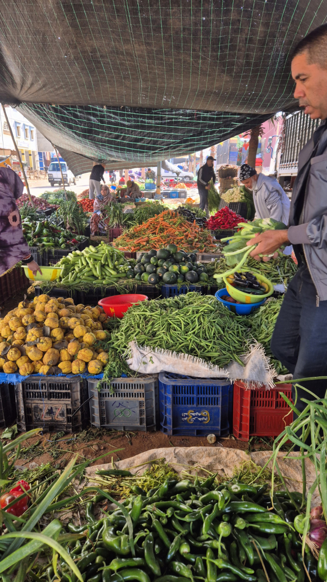 Der Ort selber ist vom Tourismus geprägt und zeigt sich so wie die meisten Orte am Meer, stark in die Jahre gekommene Uferpromenade, halb zerfallene Hotel- und Restaurant-Gebäude. Zwei drei Straßen von der Promenade weg beginnt dann das normale marokkanische Leben. Hier verbringen die Bewohner, in für uns Westeuropäer schwierig zu verstehenden Umständen ihr normales Leben. Wir besuchen den Wochenmarkt, der sich hier eine breite Straße entlang ausbreitet. Ähnlich wie schon in Sidi Ifni, interessant anzusehen. Wir kaufen in der bereits beschriebenen Manier frisches Obst und Gemüse ein.