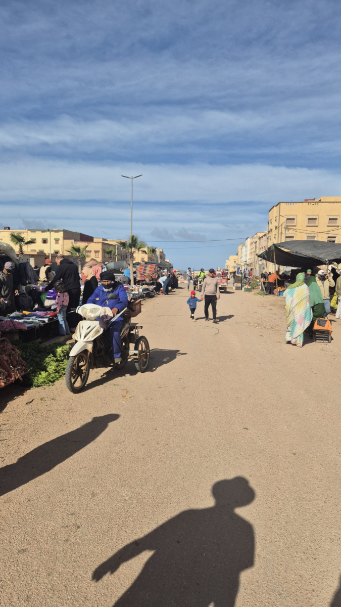 Der Ort selber ist vom Tourismus geprägt und zeigt sich so wie die meisten Orte am Meer, stark in die Jahre gekommene Uferpromenade, halb zerfallene Hotel- und Restaurant-Gebäude. Zwei drei Straßen von der Promenade weg beginnt dann das normale marokkanische Leben. Hier verbringen die Bewohner, in für uns Westeuropäer schwierig zu verstehenden Umständen ihr normales Leben. Wir besuchen den Wochenmarkt, der sich hier eine breite Straße entlang ausbreitet. Ähnlich wie schon in Sidi Ifni, interessant anzusehen. Wir kaufen in der bereits beschriebenen Manier frisches Obst und Gemüse ein.