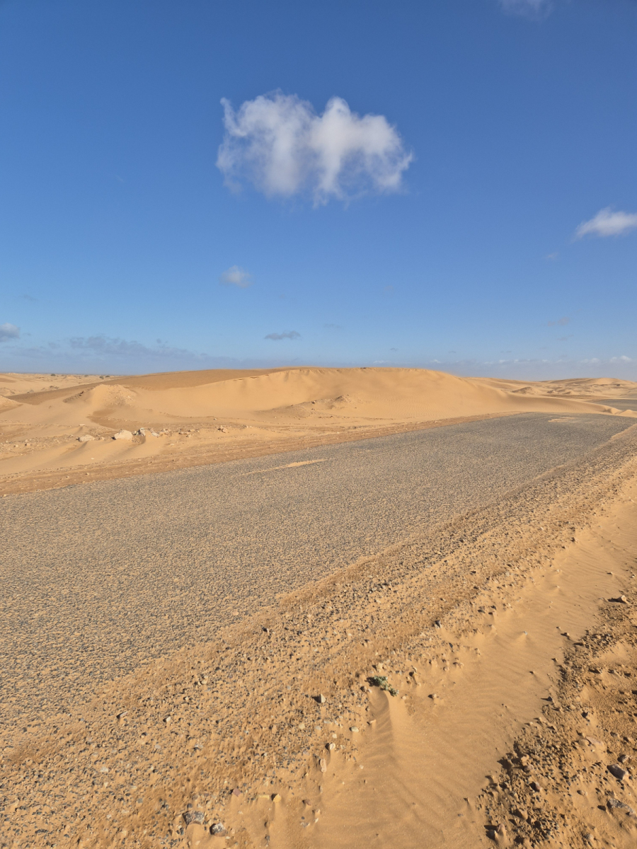 Nördlich von El Ouatia mündet der Wadi Draa in den Atlantik (Wadi steht für einen Flusslauf, der nur gelegentlich Wasser führt). Die Mündung des Draa soll sehr beeindruckend sein und deshalb machen wir einen Ausflug dorthin. Die Fahrt führt uns entlang der Küste durch die Wüstenlandschaft, vorbei an einem ehemaligen Fahrerlager aus der Zeit der Rally Paris Dakkar, hin zur Mündung. Stellenweise wird die Straße von einer Art Wanderdüne überdeckt, gar nicht so einfach die mit dem Moped zu überqueren. Das Delta des Draa ist wirklich sehr beeindruckend.