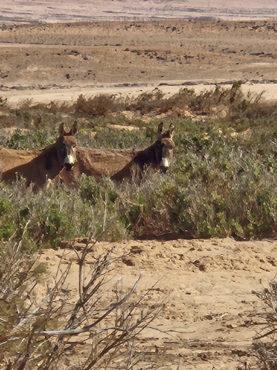 Von hier aus fahren wir dem Wadi-Verlauf entlang in Richtung Südosten, ins Landesinnere. Der Wadi führt hier nur an manchen Stellen Wasser, oft nur als feuchter Sand erkennbar. An manchen Stellen haben sich Oasen gebildet, gut erkennbar durch plötzlich einsetzende Vegetation. Hier konnten wir dann sogar freilaufende Kamele, bzw. Dromedare beobachten. Die Strecke (von Straße können wir nur selten sprechen) führt uns knappe 50 Km durch die Wüste, hier und da sieht man Behausungen, meist Zelte. Vermutlich leben hier noch vereinzelt Berber, die sich um die Kamele und Ziegen kümmern. Eine abenteuerliche Fahrt über eine Straße, deren Asphalt nur noch an manchen Stellen zu sehen ist, der Rest ist Schotter, Sand und Steine.