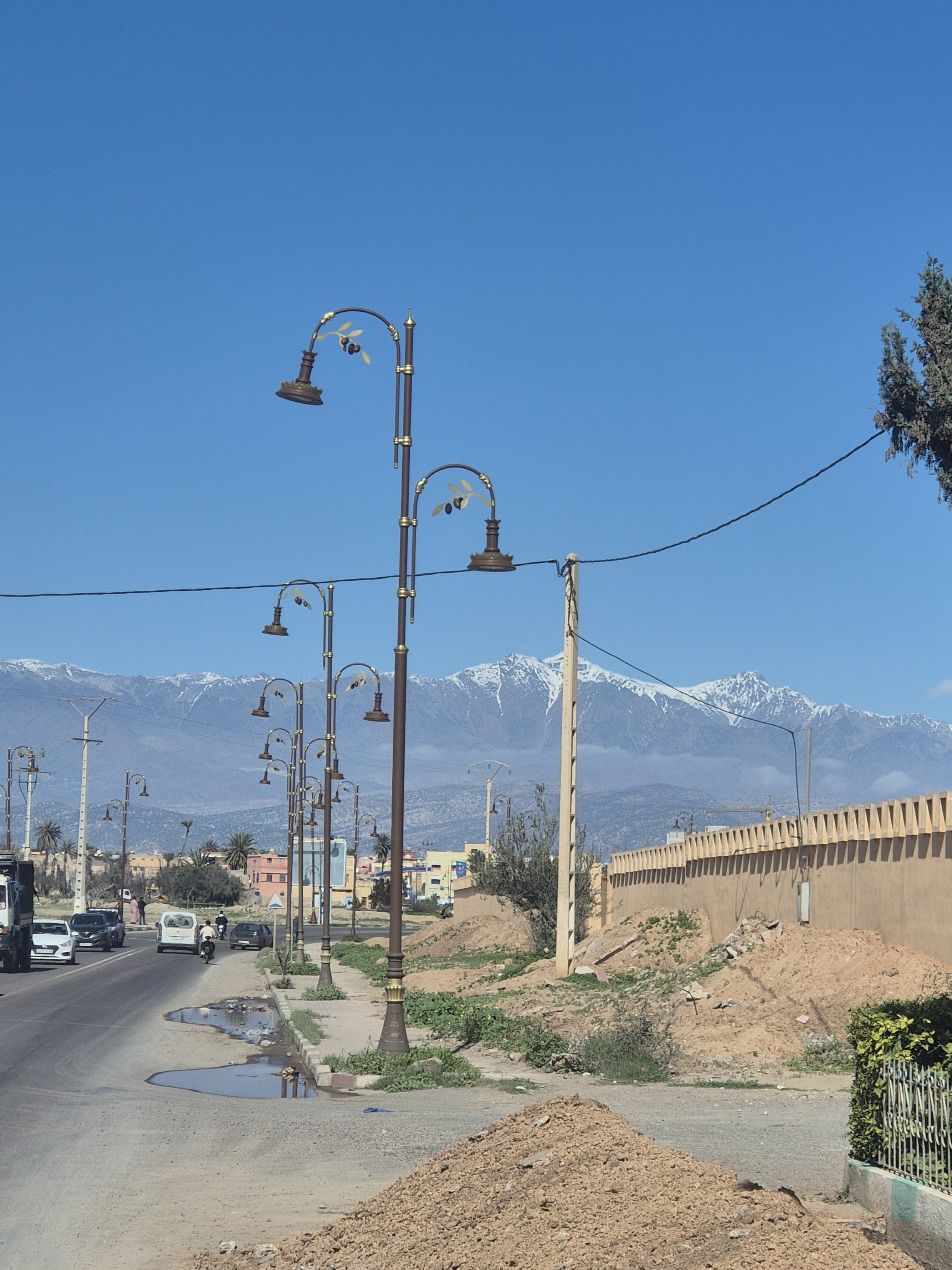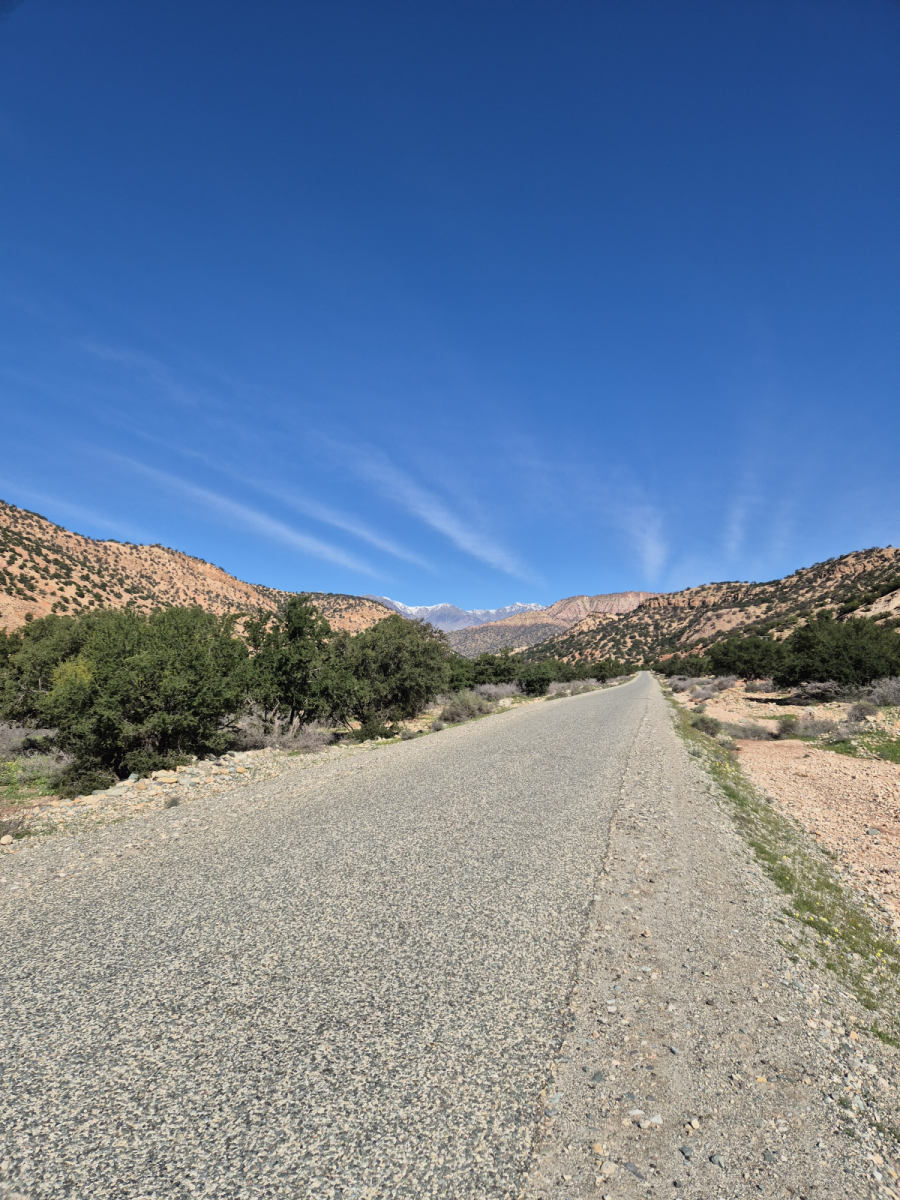 Es geht weiter nach Norden. Wir verlassen den Anti-Atlas und fahren über eine Passstraße nach Taroudannt. Der Ort liegt in einer Ebene zu Fuße des Hohen-Atlas Gebirges. Bei der Anfahrt sehen wir schon von weitem die schneebedeckten Gipfel des Gebirgszuges.
