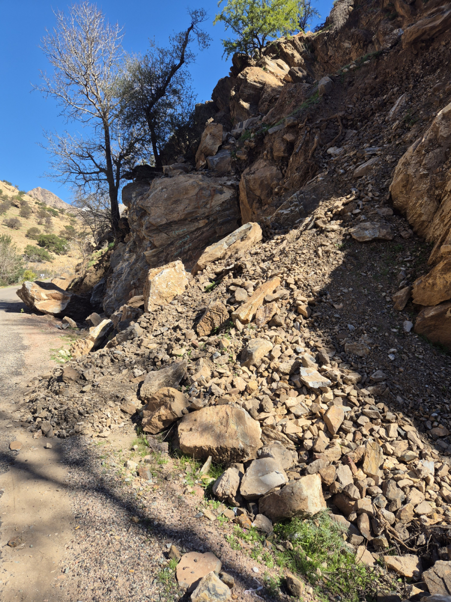 Die Regenfälle der letzten Wochen haben auch hier ihre Spuren hinterlassen. Immer wieder liegen größere Steine auf der Straße, große Felsbrocken wurden schon provisorisch auf die Seite geschoben. Manche haben großen Schaden angerichtet.