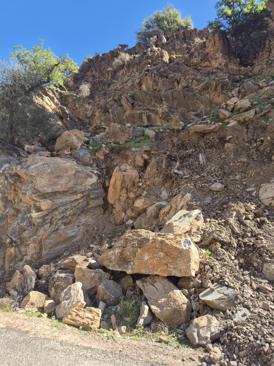 Die Regenfälle der letzten Wochen haben auch hier ihre Spuren hinterlassen. Immer wieder liegen größere Steine auf der Straße, große Felsbrocken wurden schon provisorisch auf die Seite geschoben. Manche haben großen Schaden angerichtet.