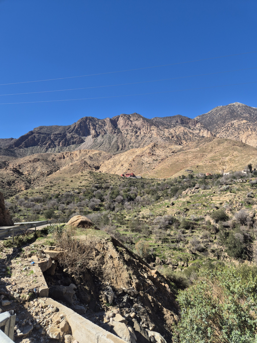 Wir haben einen Campingplatz in der Nähe der Stadt gefunden. Von hier aus machen wir eine Mopedtour, die uns ein Stück weit in den Hohen Atlas führt. Es geht auf einer engen Straße ins Gebirge. Wir schlängeln uns durch eine atemraubende Landschaft. Die Straße folgt einem Tal das der Fluss über die letzten Jahrtausende gegraben hat. Immer wieder sehen wir Dörfer, die sich an den Fels schmiegen oder direkt am Fluss liegen. Es gibt Abschnitte wo das Tal breiter ist, dort gibt es eine üppige Vegetation und Landwirtschaft.