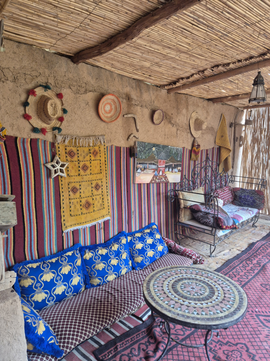 Die Oase war früher ein bedeutender Handelsplatz. Hier kamen die Berber mit ihren Kamel-Karawanen aus den Bergen, bzw. Wüstengebieten und boten ihre Erzeugnisse und Tiere zum Tausch gegen andere Güter an. Es wurde nicht mit Geld bezahlt, sondern ausschließlich getauscht. Leider ist davon heute nichts mehr übrig. Wir besuchen eine fünfhundert Jahre alte Karawanserei (Wikipedia Zitat: Eine Karawanserei war eine ummauerte Herberge an Karawanenstraßen. Reisende konnten dort mit ihren Tieren und Handelswaren sicher nächtigen und sich mit Lebensmitteln versorgen. Große Karawansereien dienten zugleich als Warenlager und Handelsplatz für Im- und Exportwaren.). Hier hat der Nachfahre des ehemaligen Besitzers alle möglichen Dinge aus der Zeit gesammelt und in dem Originalgebäude eine Art Museum eingerichtet. Wir werden herzlich empfangen, natürlich mit dem obligatorischen Minztee. Dann führt er uns durch sein Museum und erzählt zu jedem Ausstellungsstück entweder eine Geschichte oder um was es sich handelt.