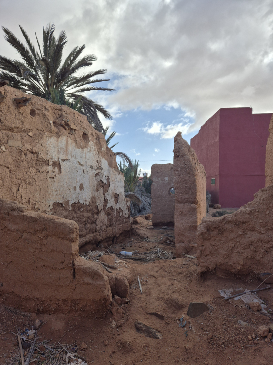 Die Oase war früher ein bedeutender Handelsplatz. Hier kamen die Berber mit ihren Kamel-Karawanen aus den Bergen, bzw. Wüstengebieten und boten ihre Erzeugnisse und Tiere zum Tausch gegen andere Güter an. Es wurde nicht mit Geld bezahlt, sondern ausschließlich getauscht. Leider ist davon heute nichts mehr übrig. Wir besuchen eine fünfhundert Jahre alte Karawanserei (Wikipedia Zitat: Eine Karawanserei war eine ummauerte Herberge an Karawanenstraßen. Reisende konnten dort mit ihren Tieren und Handelswaren sicher nächtigen und sich mit Lebensmitteln versorgen. Große Karawansereien dienten zugleich als Warenlager und Handelsplatz für Im- und Exportwaren.). Hier hat der Nachfahre des ehemaligen Besitzers alle möglichen Dinge aus der Zeit gesammelt und in dem Originalgebäude eine Art Museum eingerichtet. Wir werden herzlich empfangen, natürlich mit dem obligatorischen Minztee. Dann führt er uns durch sein Museum und erzählt zu jedem Ausstellungsstück entweder eine Geschichte oder um was es sich handelt.