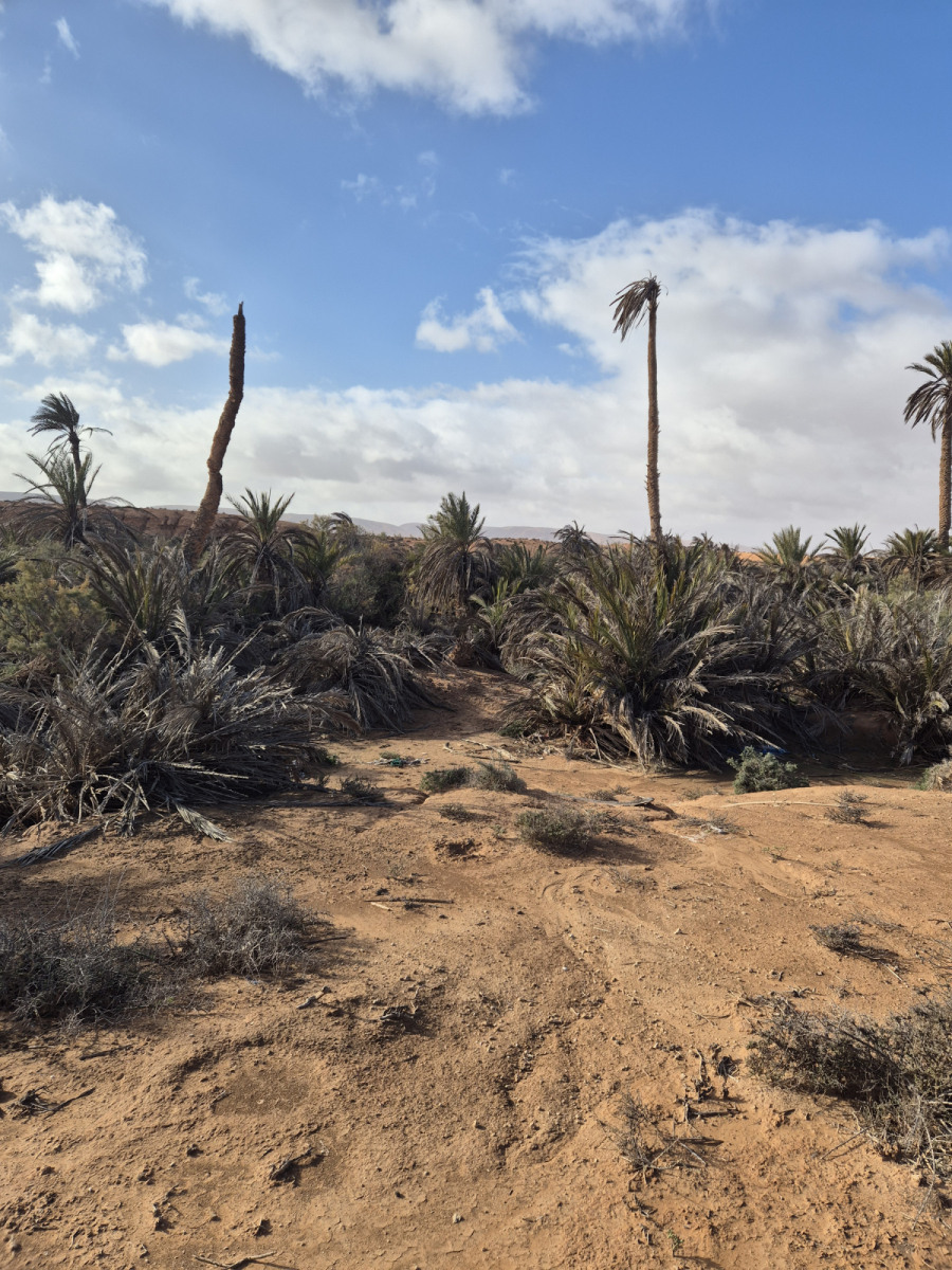 Bei unserem Spaziergang durch die Oase wird uns leider noch mal bewusst, dass Marokko, bzw. die Dattelpalmen unter einem Pilz leiden. Der überwiegende Bestand ist davon betroffen. Der Pilz nistet sich im Wurzelwerk der Palme ein und behindert dadurch im Laufe der Zeit den Transport der Nährstoffe im Stamm. Zuerst werden die Blätter braun, dann fallen sie ab und der kahle Stamm bleibt wie ein Stift stehen. Die Regierung hat eine resistente Palmenart gezüchtet, der dieser Pilz wohl nichts anhaben kann. Diese werden jetzt nach und nach kostenlos an die Landwirte verteilt. Denn die Datteln der Palme sind eine nicht geringe Einnahmequelle für die Landbevölkerung. Außerdem schützt sie die Oasen vor der Verödung. Überall auf unserer Reise durch Marokko sehen wir diese kahlen Stellen, ein trauriges Bild.