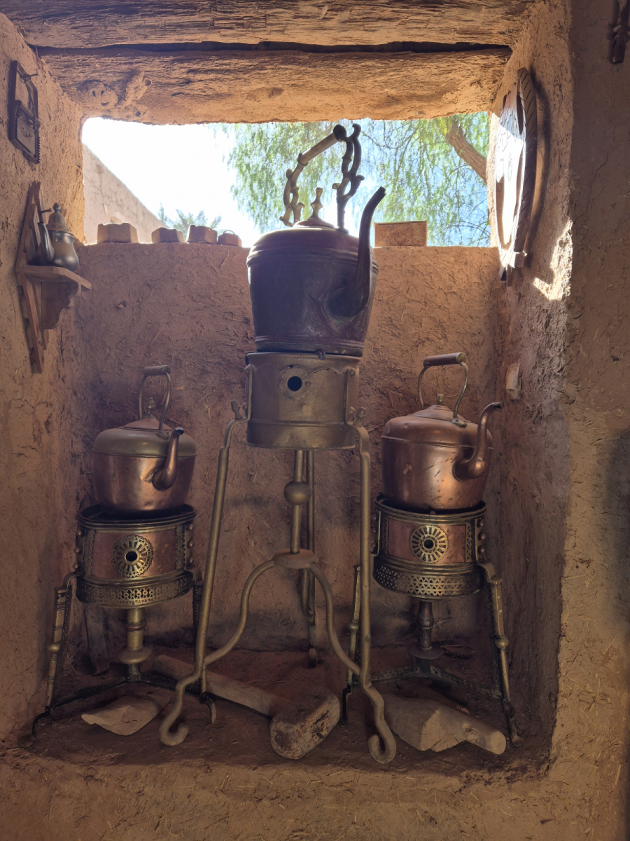Die Oase war früher ein bedeutender Handelsplatz. Hier kamen die Berber mit ihren Kamel-Karawanen aus den Bergen, bzw. Wüstengebieten und boten ihre Erzeugnisse und Tiere zum Tausch gegen andere Güter an. Es wurde nicht mit Geld bezahlt, sondern ausschließlich getauscht. Leider ist davon heute nichts mehr übrig. Wir besuchen eine fünfhundert Jahre alte Karawanserei (Wikipedia Zitat: Eine Karawanserei war eine ummauerte Herberge an Karawanenstraßen. Reisende konnten dort mit ihren Tieren und Handelswaren sicher nächtigen und sich mit Lebensmitteln versorgen. Große Karawansereien dienten zugleich als Warenlager und Handelsplatz für Im- und Exportwaren.). Hier hat der Nachfahre des ehemaligen Besitzers alle möglichen Dinge aus der Zeit gesammelt und in dem Originalgebäude eine Art Museum eingerichtet. Wir werden herzlich empfangen, natürlich mit dem obligatorischen Minztee. Dann führt er uns durch sein Museum und erzählt zu jedem Ausstellungsstück entweder eine Geschichte oder um was es sich handelt.