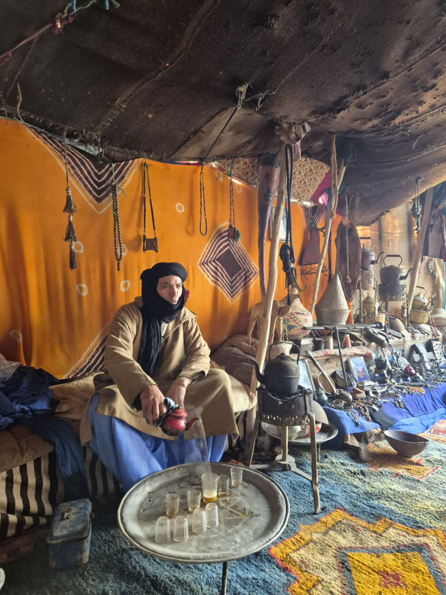 Die Oase war früher ein bedeutender Handelsplatz. Hier kamen die Berber mit ihren Kamel-Karawanen aus den Bergen, bzw. Wüstengebieten und boten ihre Erzeugnisse und Tiere zum Tausch gegen andere Güter an. Es wurde nicht mit Geld bezahlt, sondern ausschließlich getauscht. Leider ist davon heute nichts mehr übrig. Wir besuchen eine fünfhundert Jahre alte Karawanserei (Wikipedia Zitat: Eine Karawanserei war eine ummauerte Herberge an Karawanenstraßen. Reisende konnten dort mit ihren Tieren und Handelswaren sicher nächtigen und sich mit Lebensmitteln versorgen. Große Karawansereien dienten zugleich als Warenlager und Handelsplatz für Im- und Exportwaren.). Hier hat der Nachfahre des ehemaligen Besitzers alle möglichen Dinge aus der Zeit gesammelt und in dem Originalgebäude eine Art Museum eingerichtet. Wir werden herzlich empfangen, natürlich mit dem obligatorischen Minztee. Dann führt er uns durch sein Museum und erzählt zu jedem Ausstellungsstück entweder eine Geschichte oder um was es sich handelt.