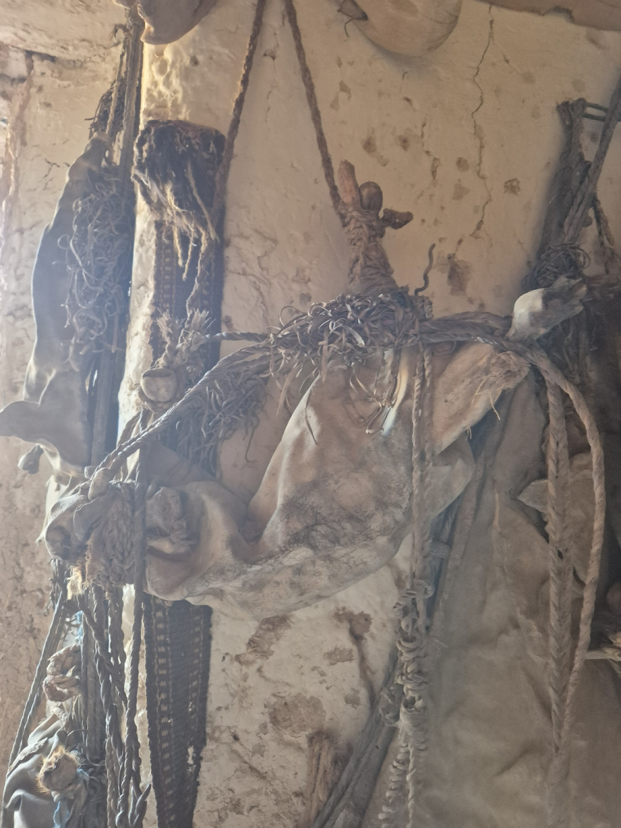 Die Oase war früher ein bedeutender Handelsplatz. Hier kamen die Berber mit ihren Kamel-Karawanen aus den Bergen, bzw. Wüstengebieten und boten ihre Erzeugnisse und Tiere zum Tausch gegen andere Güter an. Es wurde nicht mit Geld bezahlt, sondern ausschließlich getauscht. Leider ist davon heute nichts mehr übrig. Wir besuchen eine fünfhundert Jahre alte Karawanserei (Wikipedia Zitat: Eine Karawanserei war eine ummauerte Herberge an Karawanenstraßen. Reisende konnten dort mit ihren Tieren und Handelswaren sicher nächtigen und sich mit Lebensmitteln versorgen. Große Karawansereien dienten zugleich als Warenlager und Handelsplatz für Im- und Exportwaren.). Hier hat der Nachfahre des ehemaligen Besitzers alle möglichen Dinge aus der Zeit gesammelt und in dem Originalgebäude eine Art Museum eingerichtet. Wir werden herzlich empfangen, natürlich mit dem obligatorischen Minztee. Dann führt er uns durch sein Museum und erzählt zu jedem Ausstellungsstück entweder eine Geschichte oder um was es sich handelt.