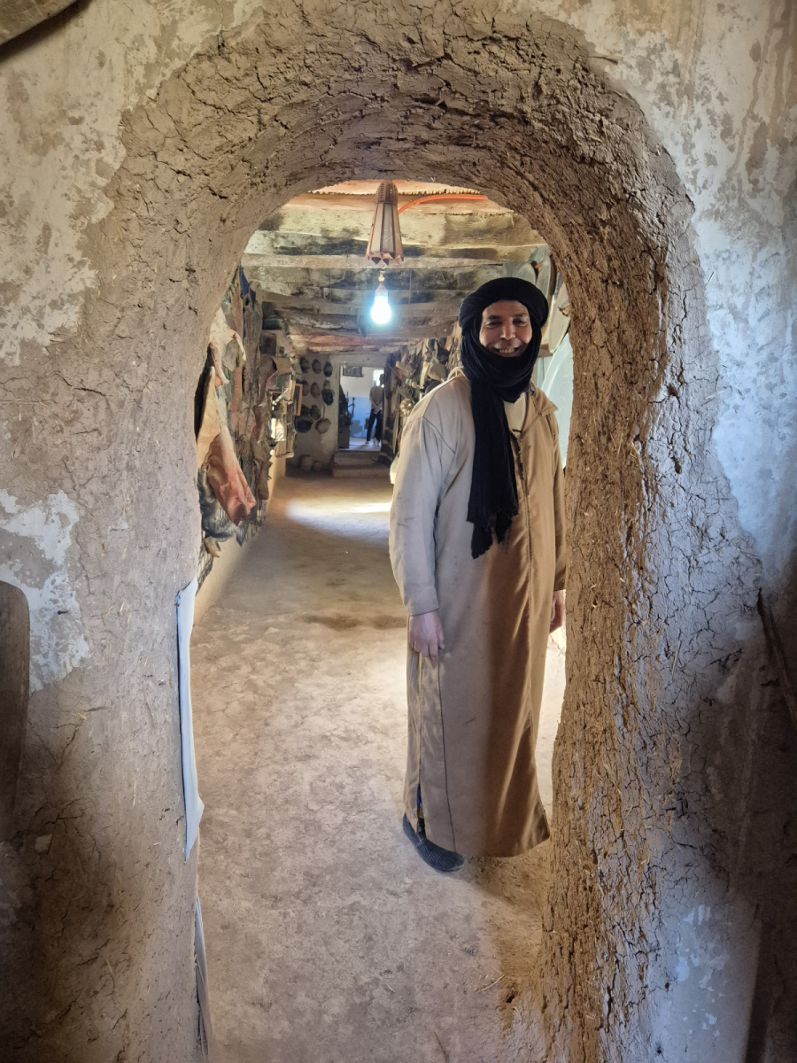 Die Oase war früher ein bedeutender Handelsplatz. Hier kamen die Berber mit ihren Kamel-Karawanen aus den Bergen, bzw. Wüstengebieten und boten ihre Erzeugnisse und Tiere zum Tausch gegen andere Güter an. Es wurde nicht mit Geld bezahlt, sondern ausschließlich getauscht. Leider ist davon heute nichts mehr übrig. Wir besuchen eine fünfhundert Jahre alte Karawanserei (Wikipedia Zitat: Eine Karawanserei war eine ummauerte Herberge an Karawanenstraßen. Reisende konnten dort mit ihren Tieren und Handelswaren sicher nächtigen und sich mit Lebensmitteln versorgen. Große Karawansereien dienten zugleich als Warenlager und Handelsplatz für Im- und Exportwaren.). Hier hat der Nachfahre des ehemaligen Besitzers alle möglichen Dinge aus der Zeit gesammelt und in dem Originalgebäude eine Art Museum eingerichtet. Wir werden herzlich empfangen, natürlich mit dem obligatorischen Minztee. Dann führt er uns durch sein Museum und erzählt zu jedem Ausstellungsstück entweder eine Geschichte oder um was es sich handelt.