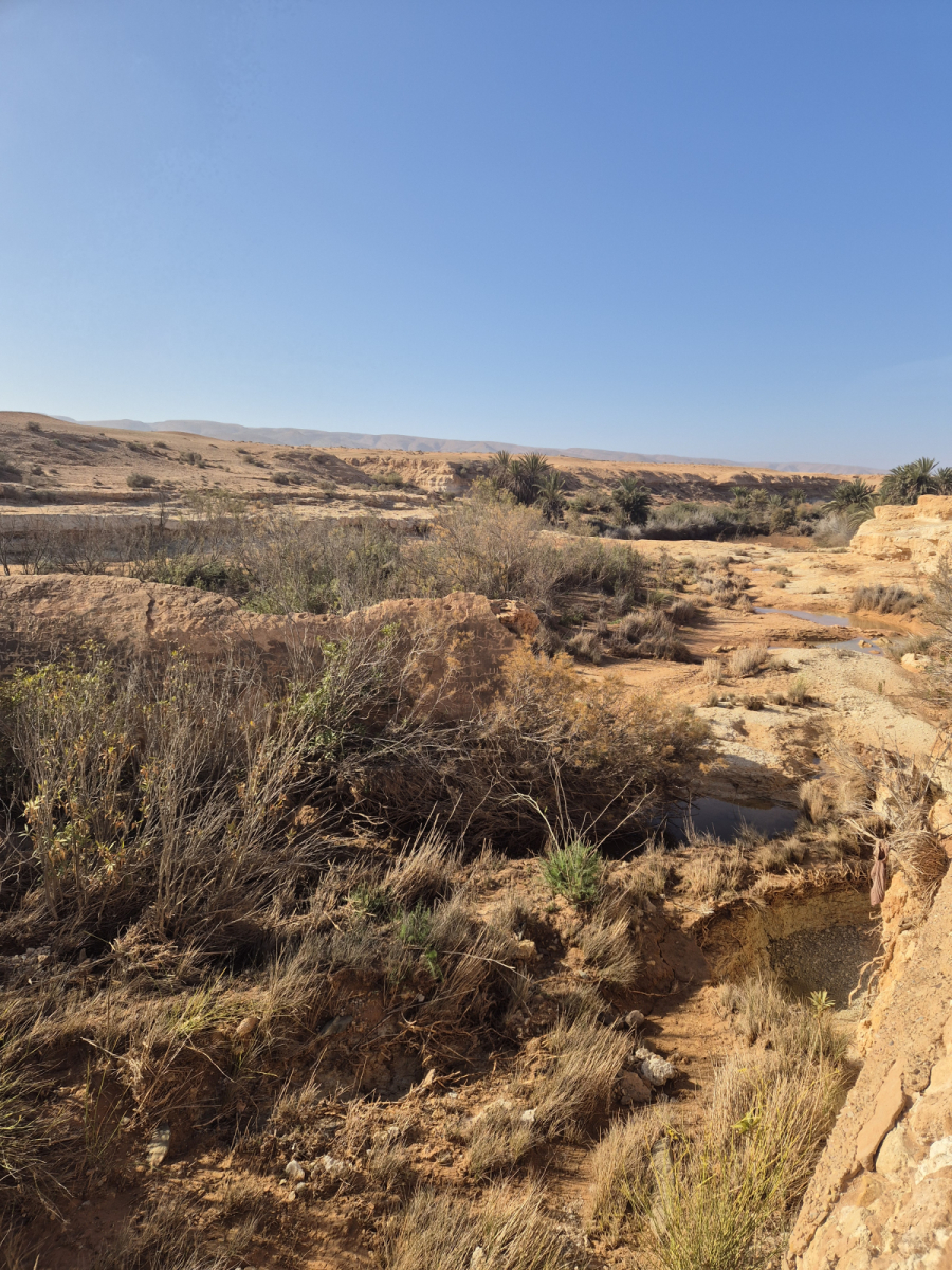 Unser zweiter Ausflug führt von der Oase zu einer heißen Quelle, die mitten in der Geröllwüste sprudelt. Es gibt keinen richtigen Weg, nur die von den Geländewagen gefahrenen Spuren im Sand. Die fahren hier regelmäßig die Touristen durch das Gelände. Wir folgen mehrmals einer falschen Spur und müssen umkehren, doch am Ende finden wir die Quelle, in der dann auch prompt drei weibliche Touristen „baden“. Zwei Berberführer hatten sie in einem kleinen Anhänger zur Personenbeförderung, der an deren Quad montiert war hier hin gebracht. Wir schauen uns das kurz an und fahren dann weiter über abenteuerliches Gelände.