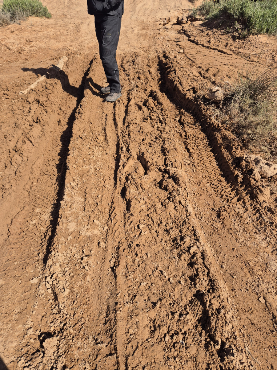 Unser zweiter Ausflug führt von der Oase zu einer heißen Quelle, die mitten in der Geröllwüste sprudelt. Es gibt keinen richtigen Weg, nur die von den Geländewagen gefahrenen Spuren im Sand. Die fahren hier regelmäßig die Touristen durch das Gelände. Wir folgen mehrmals einer falschen Spur und müssen umkehren, doch am Ende finden wir die Quelle, in der dann auch prompt drei weibliche Touristen „baden“. Zwei Berberführer hatten sie in einem kleinen Anhänger zur Personenbeförderung, der an deren Quad montiert war hier hin gebracht. Wir schauen uns das kurz an und fahren dann weiter über abenteuerliches Gelände.