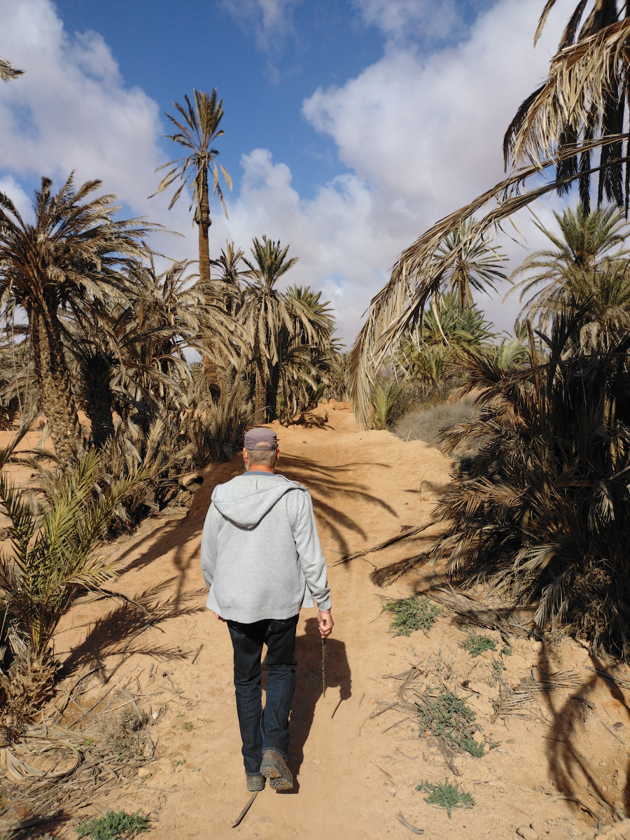 Bei unserem Spaziergang durch die Oase wird uns leider noch mal bewusst, dass Marokko, bzw. die Dattelpalmen unter einem Pilz leiden. Der überwiegende Bestand ist davon betroffen. Der Pilz nistet sich im Wurzelwerk der Palme ein und behindert dadurch im Laufe der Zeit den Transport der Nährstoffe im Stamm. Zuerst werden die Blätter braun, dann fallen sie ab und der kahle Stamm bleibt wie ein Stift stehen. Die Regierung hat eine resistente Palmenart gezüchtet, der dieser Pilz wohl nichts anhaben kann. Diese werden jetzt nach und nach kostenlos an die Landwirte verteilt. Denn die Datteln der Palme sind eine nicht geringe Einnahmequelle für die Landbevölkerung. Außerdem schützt sie die Oasen vor der Verödung. Überall auf unserer Reise durch Marokko sehen wir diese kahlen Stellen, ein trauriges Bild.