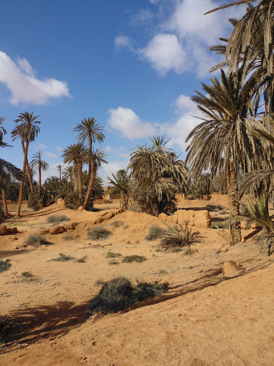 Bei unserem Spaziergang durch die Oase wird uns leider noch mal bewusst, dass Marokko, bzw. die Dattelpalmen unter einem Pilz leiden. Der überwiegende Bestand ist davon betroffen. Der Pilz nistet sich im Wurzelwerk der Palme ein und behindert dadurch im Laufe der Zeit den Transport der Nährstoffe im Stamm. Zuerst werden die Blätter braun, dann fallen sie ab und der kahle Stamm bleibt wie ein Stift stehen. Die Regierung hat eine resistente Palmenart gezüchtet, der dieser Pilz wohl nichts anhaben kann. Diese werden jetzt nach und nach kostenlos an die Landwirte verteilt. Denn die Datteln der Palme sind eine nicht geringe Einnahmequelle für die Landbevölkerung. Außerdem schützt sie die Oasen vor der Verödung. Überall auf unserer Reise durch Marokko sehen wir diese kahlen Stellen, ein trauriges Bild.