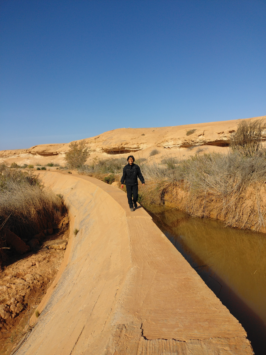 Unser zweiter Ausflug führt von der Oase zu einer heißen Quelle, die mitten in der Geröllwüste sprudelt. Es gibt keinen richtigen Weg, nur die von den Geländewagen gefahrenen Spuren im Sand. Die fahren hier regelmäßig die Touristen durch das Gelände. Wir folgen mehrmals einer falschen Spur und müssen umkehren, doch am Ende finden wir die Quelle, in der dann auch prompt drei weibliche Touristen „baden“. Zwei Berberführer hatten sie in einem kleinen Anhänger zur Personenbeförderung, der an deren Quad montiert war hier hin gebracht. Wir schauen uns das kurz an und fahren dann weiter über abenteuerliches Gelände.