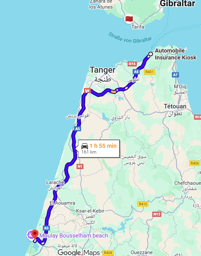 Der Ort liegt ca. 160 Km von Tanger Med entfernt direkt am Atlantik und nur 5 Minuten bis zur Autobahn. Damit verkehrsgünstig für alle die in den Süden fahren und nach der Fährüberfahrt ihren ersten Stopp machen wollen. Direkt am Ort gibt es eine recht große Lagune, die ins Meer mündet und von verschiedensten Vogelarten genutzt wird. Es werden dazu auch Bootstouren zur Vogelbeobachtung in der Lagune angeboten.