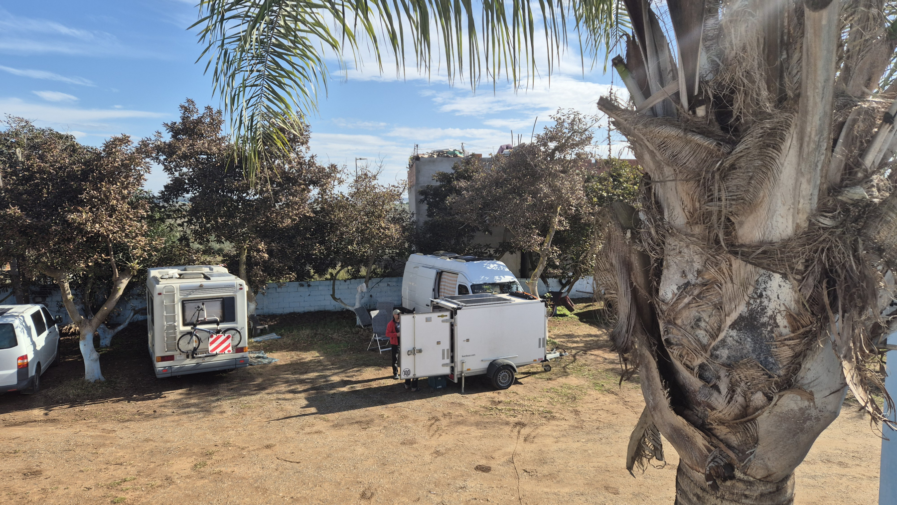Es war genau so ein privater Platz in dem ummauerten Vorgarten eines Wohnhauses. In einem Nebengebäude werden einfache Zimmer vermietet. Die Fahrzeuge stehen zwischen Avocado Bäumen, mit denen der Besitzer früher nach seiner Aussage sein Geld verdient hat. Toiletten und Duschen einfach aber sauber. Tagsüber laufen die Kinder des Besitzers auf dem Platz herum, mehrere Frauen kümmern sich um die Hauswirtschaft. Sie bereiten auch Tajine auf Bestellung für die Gäste her. Also alles sehr familiär.