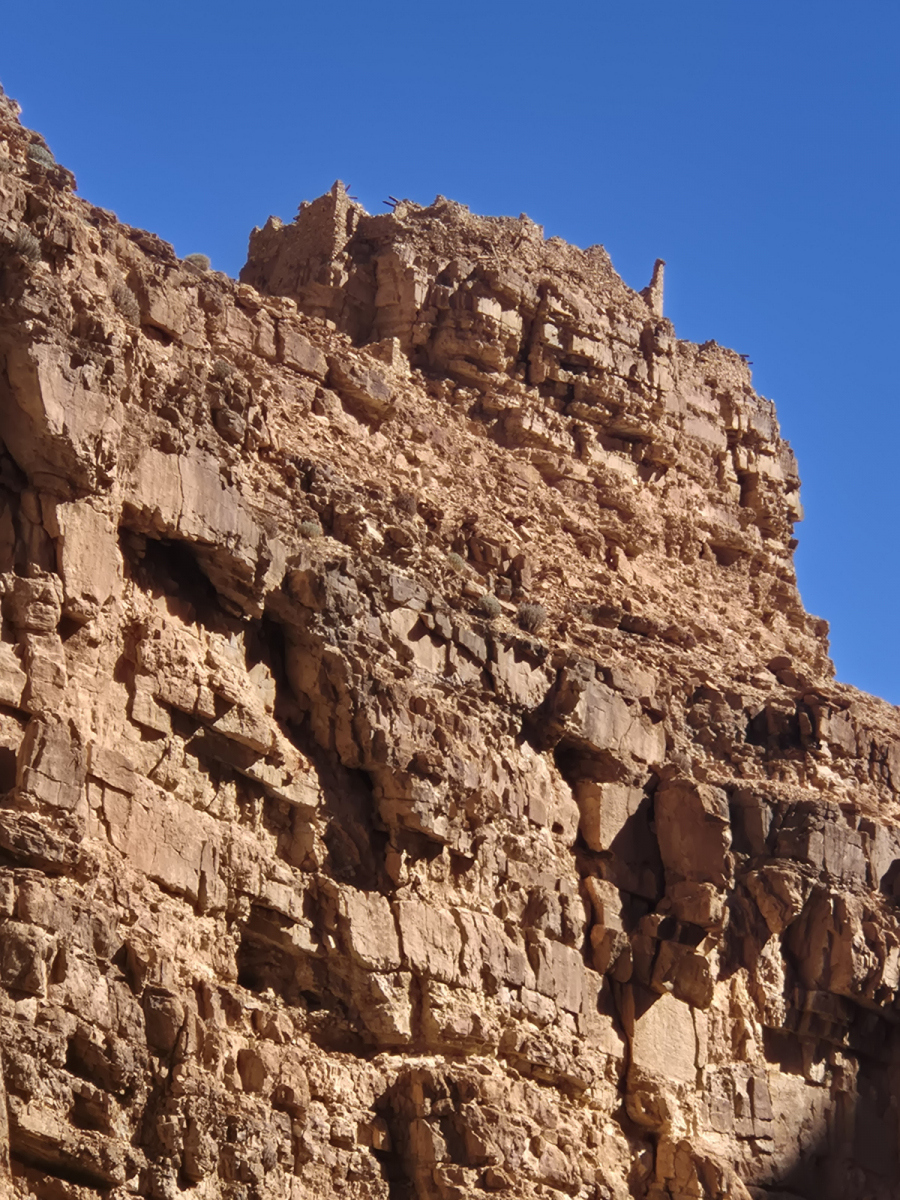 Auf dieser Wanderung laufen wir auch durch ein Berberdorf, in dem noch einige alte Gebäude übrig sind. Von weitem sind diese kaum von den Felsen zu unterscheiden. Klar, weil die das Gestein auch für den Bau der Häuser genutzt haben. An manchen Stellen stehen die Gebäude so nah unter den Felsen, dass man befürchten muss, dass diese in nächster Zeit von den Felsen erschlagen werden könnten.