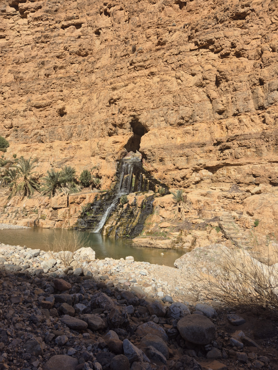 Am Ende der Straße liegt, wie schon erwähnt ein kleines Dorf. Hier stellen wir unser Moped mitten im Ort ab und gehen zu Fuß weiter durch das Flussbett. Hier erwartet uns etwas besonderes, denn hier hat der Fluss einen schmalen Felsstreifen gebildet und die Natur einen Tunnel gegraben, der auf die andere Seite führt. Man kann diesen Tunnel durchwandern, wenn kein Wasser fließt. Wir konnten das nicht, weil der Fluss durch die Regenfälle der letzten Wochen Wasser führt. Wir wandern weiter und sehen auf der anderen Seite wo das Wasser in einem kleinen Wasserfall wieder austritt.