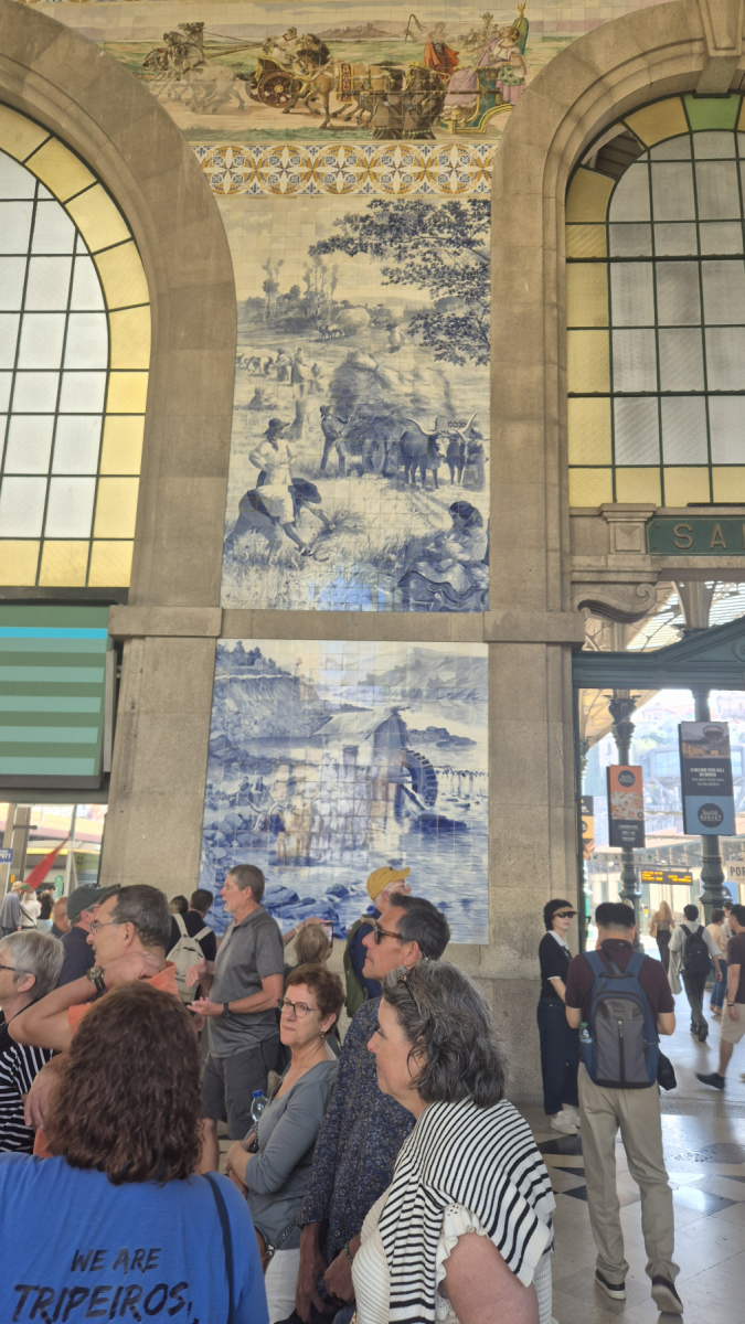 Warum der Hauptbahnhof? Portugal ist bekannt für seine Azulejos, kunstvoll gestaltete Keramikfliesen, die eine zentrale Rolle in der portugiesischen Kultur und Architektur spielen. Man sieht sie überall, entweder als Verkleidung außen an den Wänden oder als Schmuck auch innen. Der Bahnhof in Porto ist in der Vorhalle komplett damit ausgestattet: