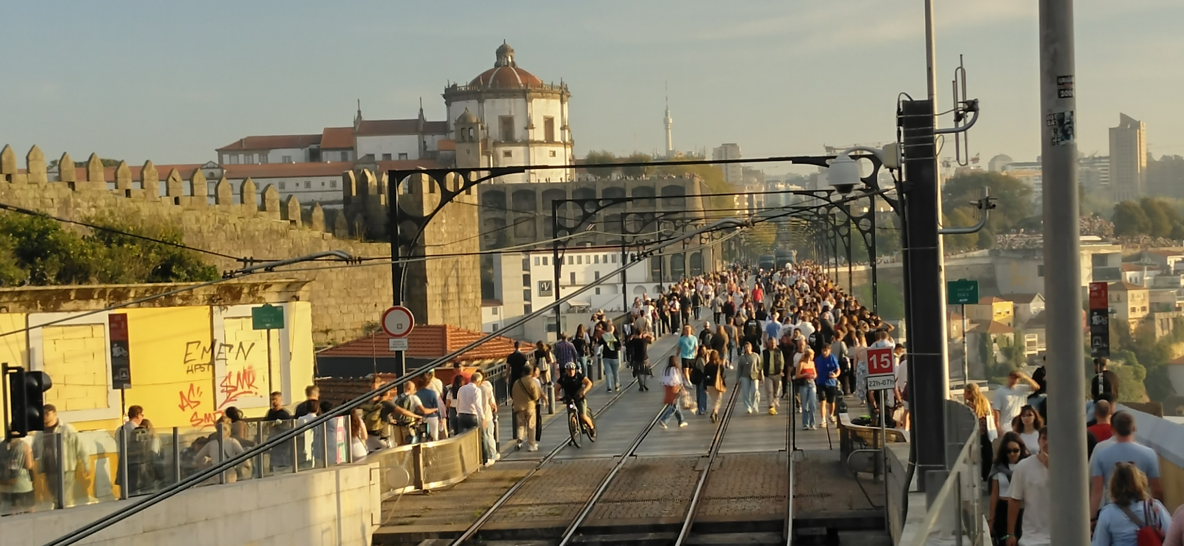 Man kann zwar mit den öffentlichen Verkehrsmitteln in die Stadt fahren, doch da die Beschaffung der Fahrkarten nicht ganz einfach ist, probieren wir auf Empfehlung mal was Neues (zumindest für uns). Wir bestellen uns einen Uber! Das ist erstaunlich einfach und angenehm, App runterladen, Account einrichten, ein Fahrzeug bestellen und los geht’s. Wir lassen uns vor dem Park abholen und uns zur imposanten Brücke „Ponte Luis I“ bringen. Von hier aus kommt man schnell auf die andere Seite und ist direkt in der Altstadt. Womit wir nicht gerechnet hatten war, dass wir nicht die einzigen Touristen in der Stadt waren.