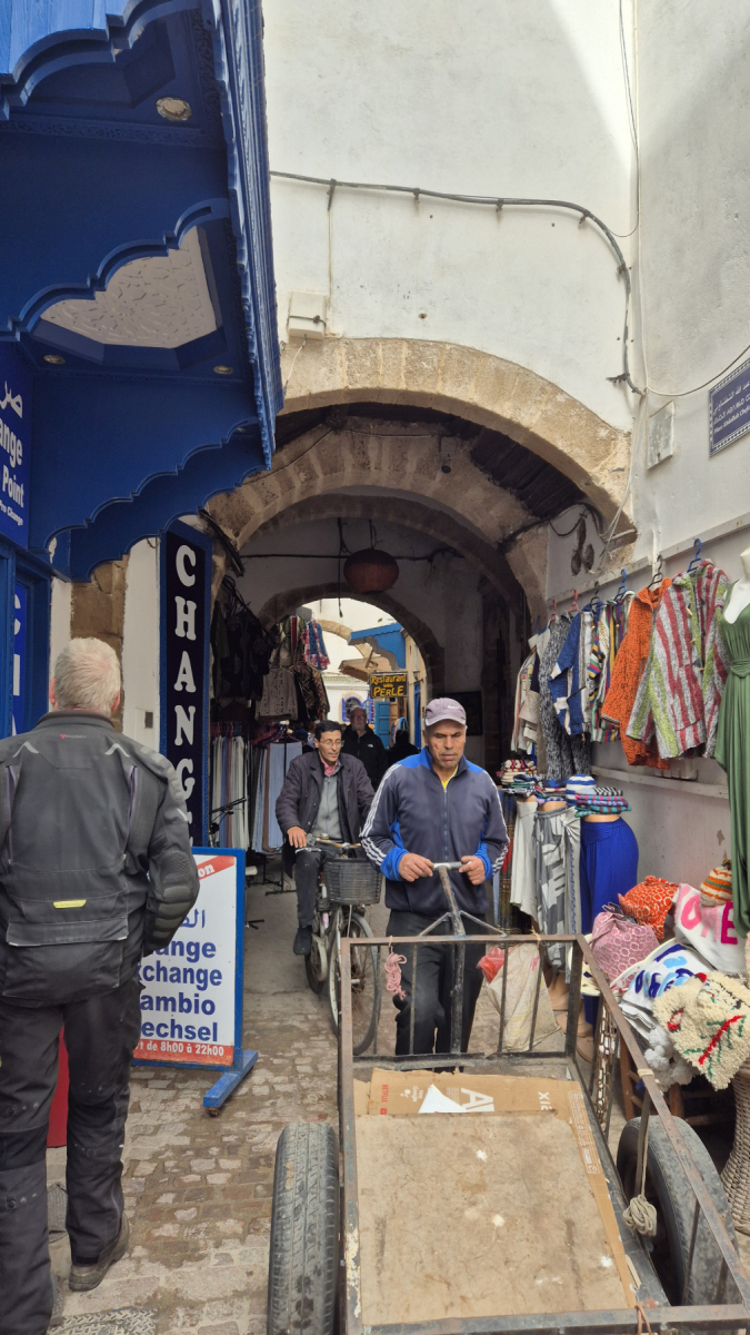 Essaouira ist eine Hafenstadt an Marokkos Atlantikküste. Die Medina (Altstadt) ist von Befestigungsmauern aus dem 18. Jahrhundert umgeben, die entlang der Küste verlaufen. Sie werden als Skala de la Kasbah bezeichnet und wurden einst von europäischen Ingenieuren entworfen. Die Mauern sind mit alten Messingkanonen gesäumt und bieten Meerblick. Es liegt ca. 30 Kilometer von unserem Campingplatz entfernt und wir fahren zur Besichtigung mit dem Moped.