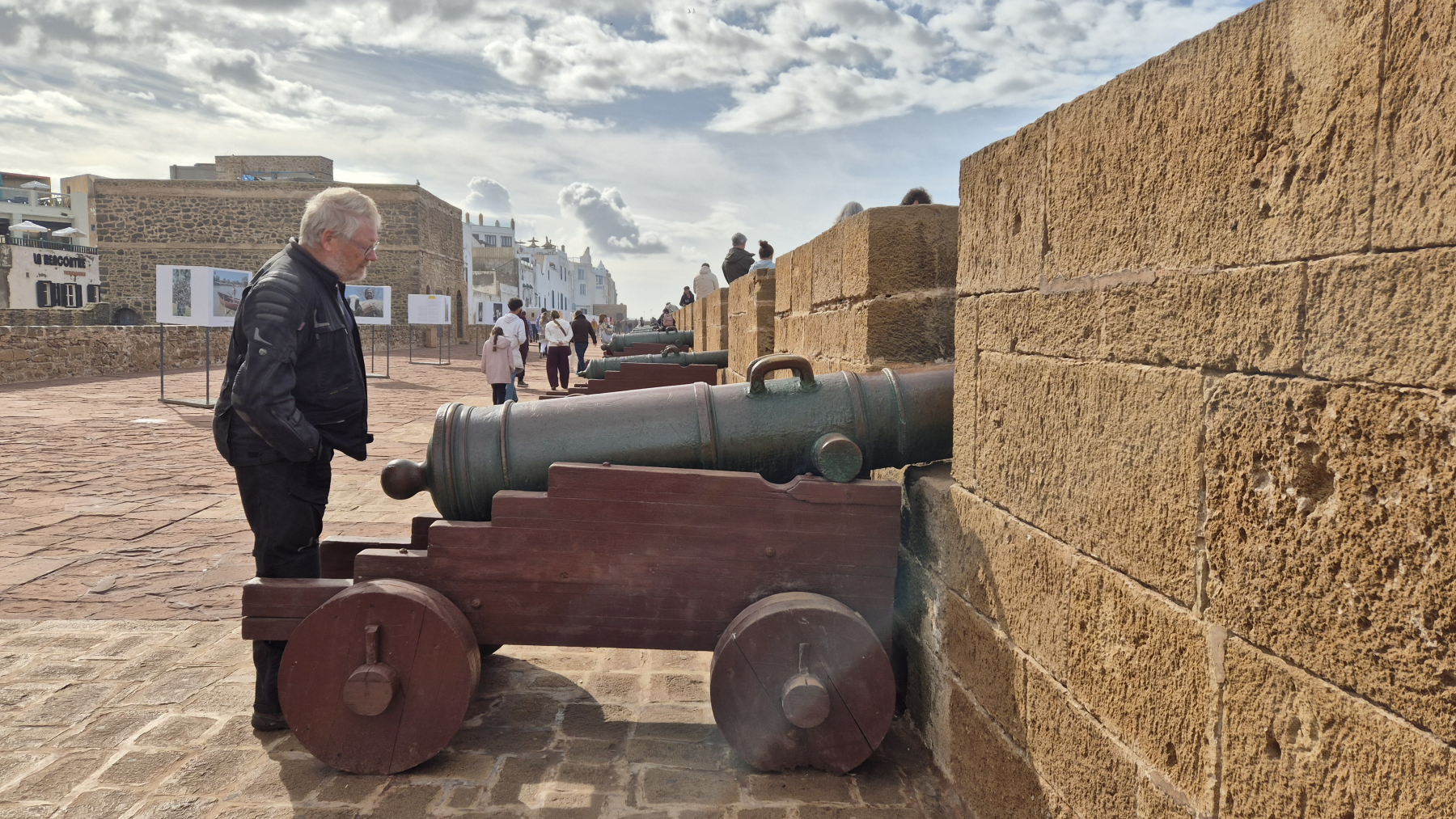Essaouira ist eine Hafenstadt an Marokkos Atlantikküste. Die Medina (Altstadt) ist von Befestigungsmauern aus dem 18. Jahrhundert umgeben, die entlang der Küste verlaufen. Sie werden als Skala de la Kasbah bezeichnet und wurden einst von europäischen Ingenieuren entworfen. Die Mauern sind mit alten Messingkanonen gesäumt und bieten Meerblick. Es liegt ca. 30 Kilometer von unserem Campingplatz entfernt und wir fahren zur Besichtigung mit dem Moped.
