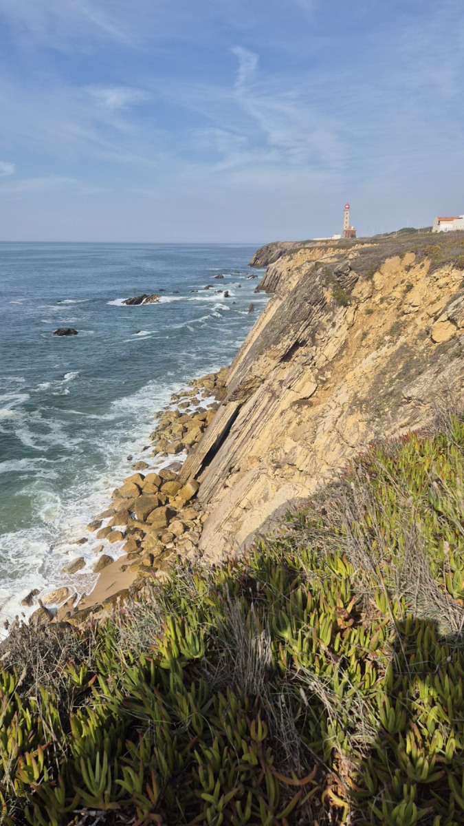 Farol ist das portugiesische Wort für Leuchtturm, der hier am Cabo Sardao steht. Allerdings sind wir nicht deswegen hier mit dem Moped hingefahren. Vielmehr wegen einer Besonderheit an der Felsküste. Hier nisten nämlich Störche auf den Felsvorsprüngen. Soweit wir wissen ist das ein absolutes Novum und kann nirgends anderswo gefunden werden.