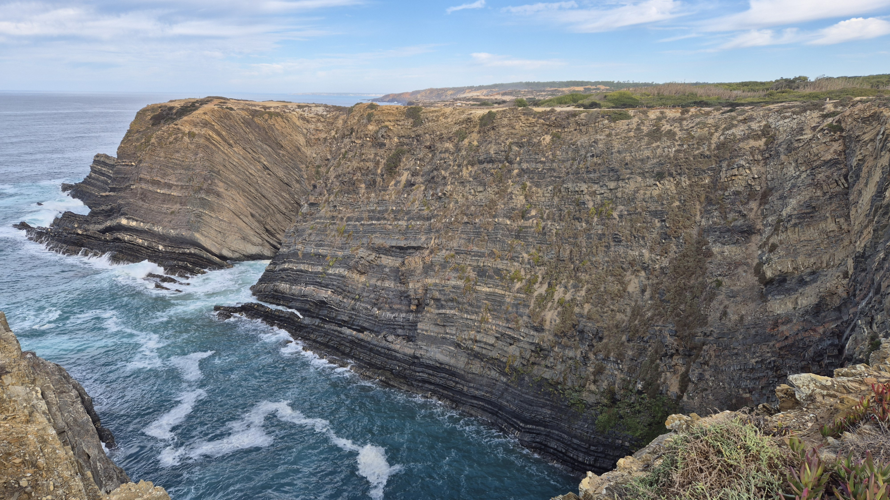 Farol ist das portugiesische Wort für Leuchtturm, der hier am Cabo Sardao steht. Allerdings sind wir nicht deswegen hier mit dem Moped hingefahren. Vielmehr wegen einer Besonderheit an der Felsküste. Hier nisten nämlich Störche auf den Felsvorsprüngen. Soweit wir wissen ist das ein absolutes Novum und kann nirgends anderswo gefunden werden.