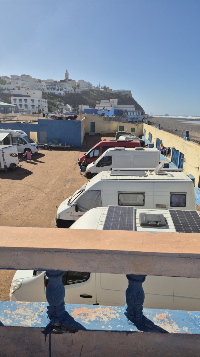 Wir sind weiter Richtung Süden unterwegs. Unser aktueller (06.01.2026) Platz ist Sidi Ifni. Ein ehemaliger spanischer Ort an der Küste. Heute ein Touristenort und Surfer-Hotspot. Es gibt drei Campingplätze und alle sind gut belegt. Wir haben Glück und bekommen einen Platz bei unserem Favoriten. Er liegt direkt am Meer, ist aber leider von einer Mauer umgeben. Es gibt aber eine Terrasse die man hochsteigen kann, von dort haben wir einen schönen Ausblick auf den Strand und Abends den Sonnenuntergang. Hier wollen wir ein paar Tage „rumhängen“, Spaziergänge am Strand und vielleicht einen Ausflug mit dem Moped machen.