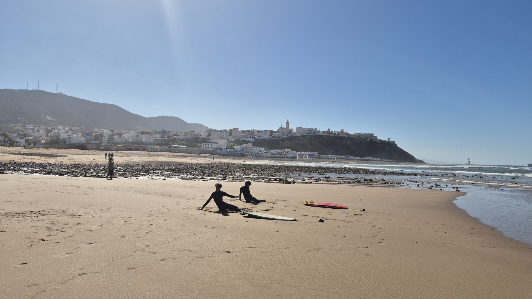 Wir sind weiter Richtung Süden unterwegs. Unser aktueller (06.01.2026) Platz ist Sidi Ifni. Ein ehemaliger spanischer Ort an der Küste. Heute ein Touristenort und Surfer-Hotspot. Es gibt drei Campingplätze und alle sind gut belegt. Wir haben Glück und bekommen einen Platz bei unserem Favoriten. Er liegt direkt am Meer, ist aber leider von einer Mauer umgeben. Es gibt aber eine Terrasse die man hochsteigen kann, von dort haben wir einen schönen Ausblick auf den Strand und Abends den Sonnenuntergang. Hier wollen wir ein paar Tage „rumhängen“, Spaziergänge am Strand und vielleicht einen Ausflug mit dem Moped machen.