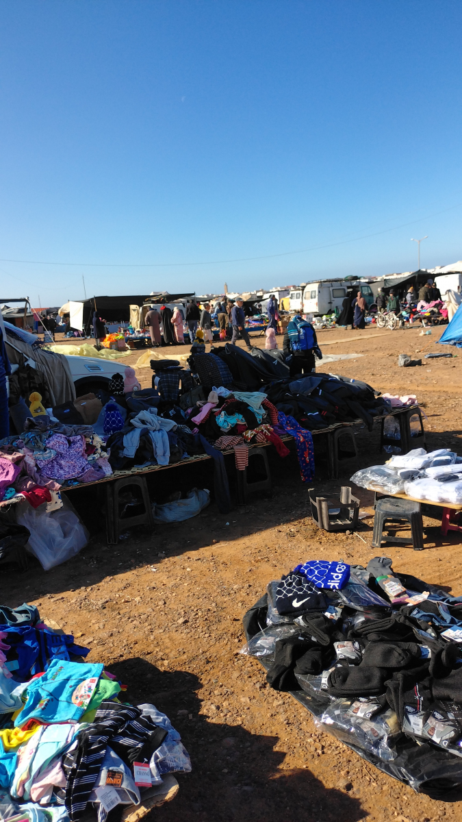 Dies wird unser erster Wochenmarkt in Marokko. Bisher haben wir „nur“ Souks gesehen (dauerhafte Marktstände in den Straßen der Städte). Das hier ist etwas völlig anderes, auf einer großen, aus festgetretenem Sandboden bestehenden Fläche werden Zelte aufgestellt. Sie erinnern an Berberzelte aus der Wüste. Ein Großteil der Waren wird auf am Boden liegende Decken ausgebreitet. Neben dem üblichen „Kram“ (ähnlich einem Flohmarkt) werden Kleidung, Haushaltswaren, Werkzeug und vor allem Obst und Gemüse angeboten. Man nimmt sich einfach eine der vielen Plastikschüsseln an einem solchen Stand und lädt Obst und Gemüse rein und geht dann zum Kassierer. Der hat eine Waage, stellt die Schüssel drauf, dann schaut er kurz auf das Display und sagt dir einen Preis. Danach schüttet er alles in eine Tüte, fertig! Bei einigen Waagen hatten wir Zweifel, dass die funktionieren, bzw. überhaupt eingeschaltet waren. Da alles sehr preiswert ist, interessiert es auch nicht wirklich. Oft verstehen wir auch den Kassierer nicht, dann geben wir ihm einen 50 Dirham-Schein (5 Euro) und er gibt uns das Wechselgeld raus.
